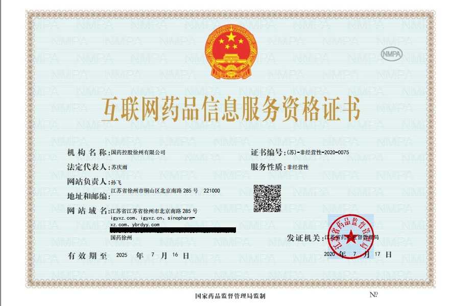 0516-8010-1098 江蘇省徐州市高新技術(shù)開發(fā)區(qū) 北京南路283號(hào)萬(wàn)泰廣場(chǎng)1號(hào)樓7-13層 互聯(lián)網(wǎng)藥品信息服務(wù)資格證書